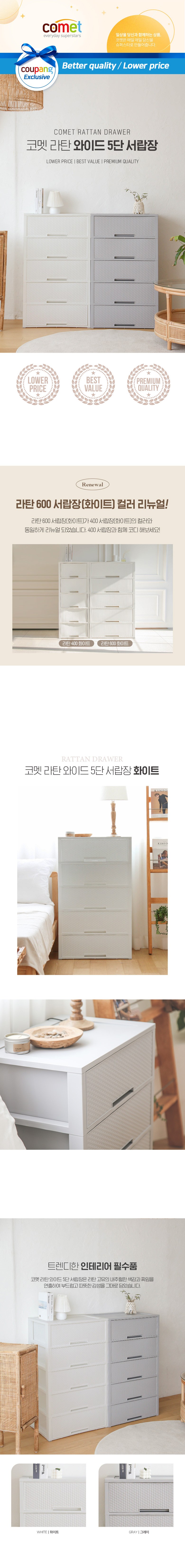 코멧 5단 라탄 서랍장 와이드 600, 화이트